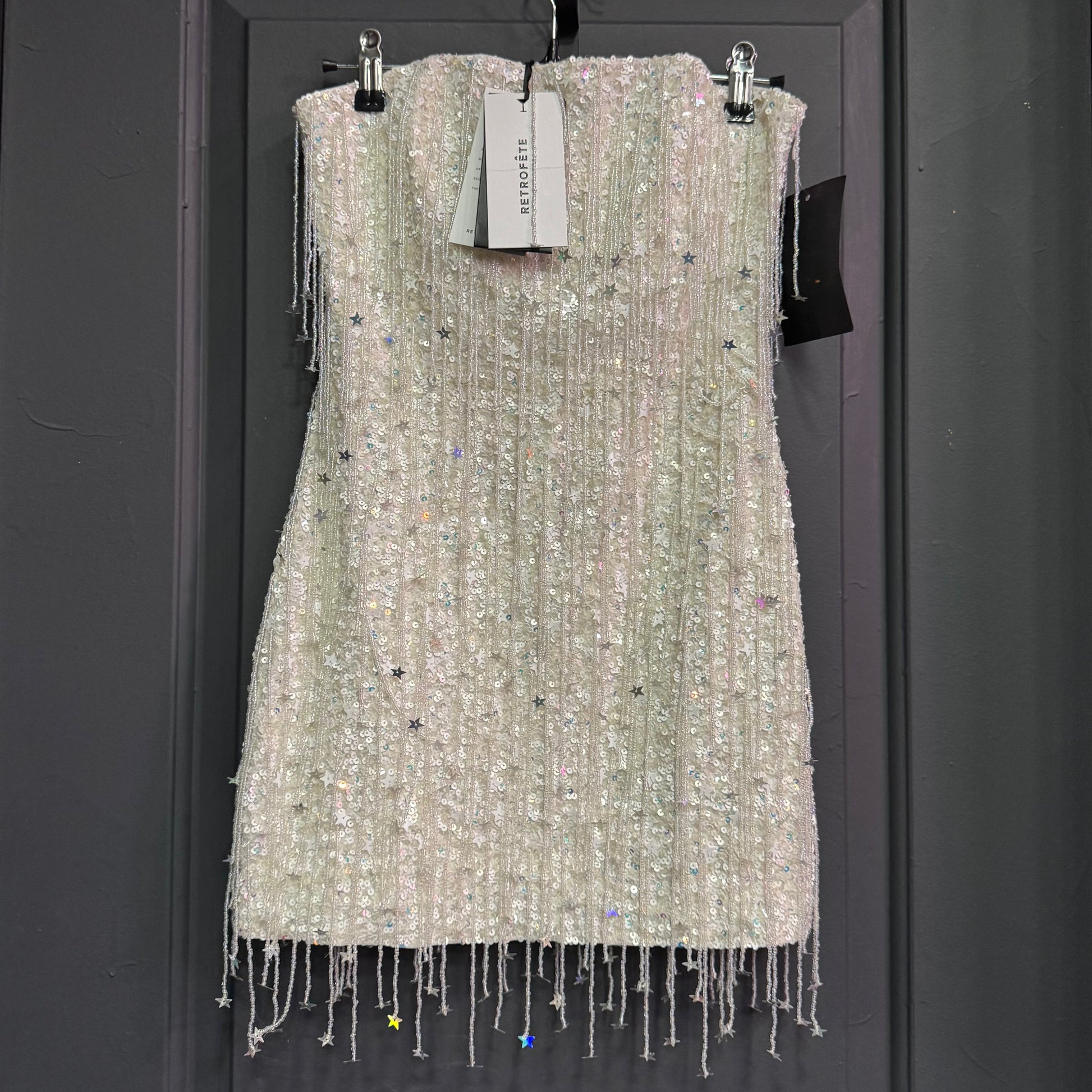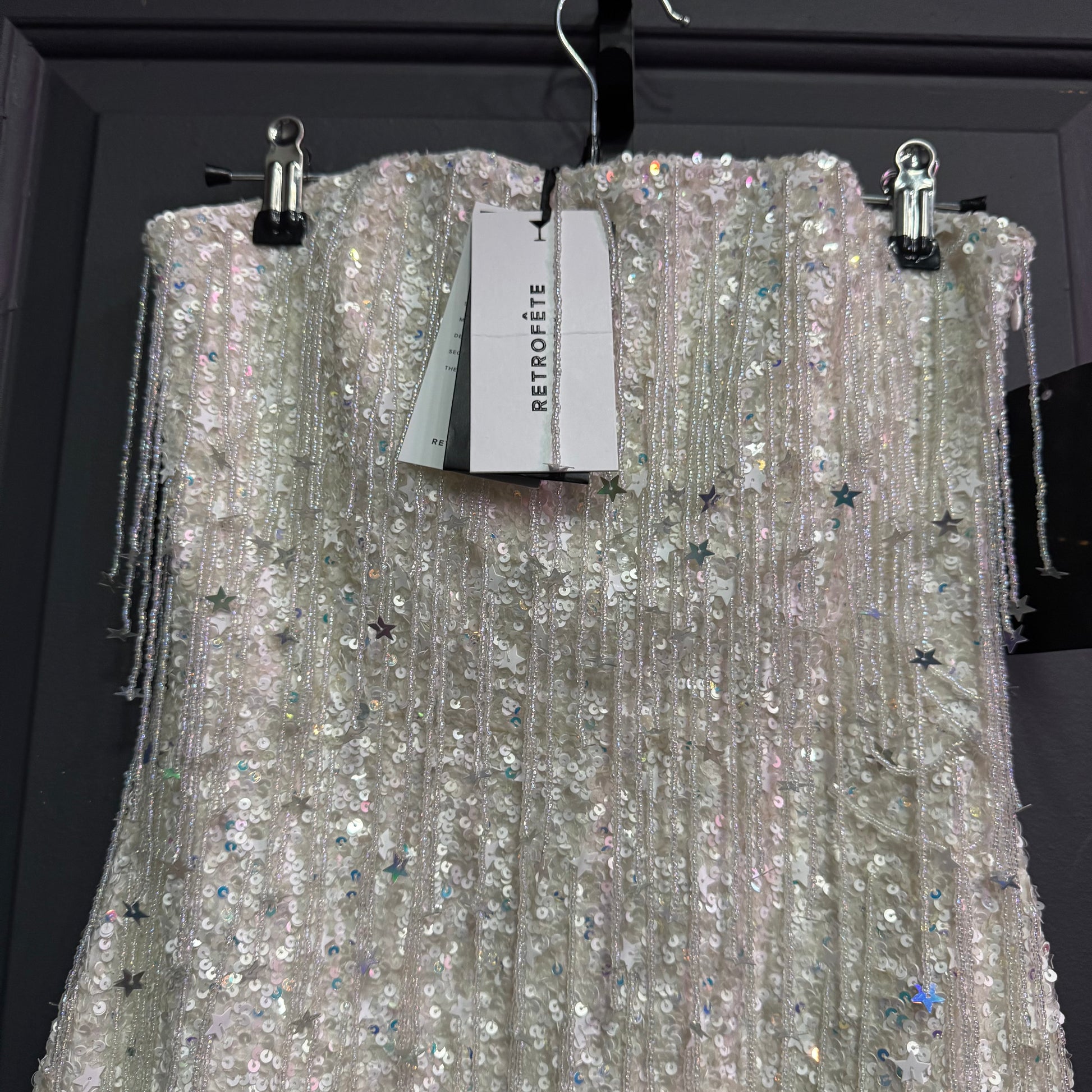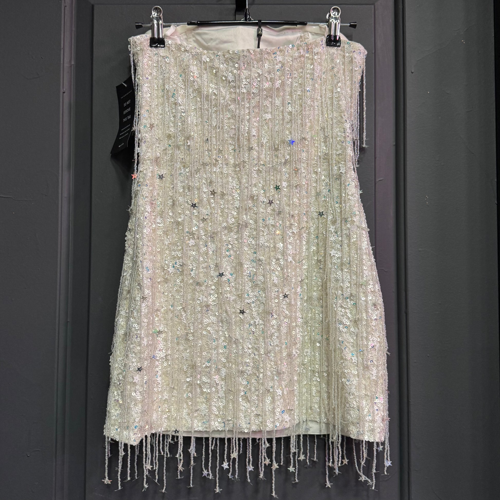 The Heather Dress shines bright in its hand-stitched star-shaped sequin fabrication and dangling beads. The dress features supportive boning through the bodice to contour the curves of the body and an invisible side zip closure.