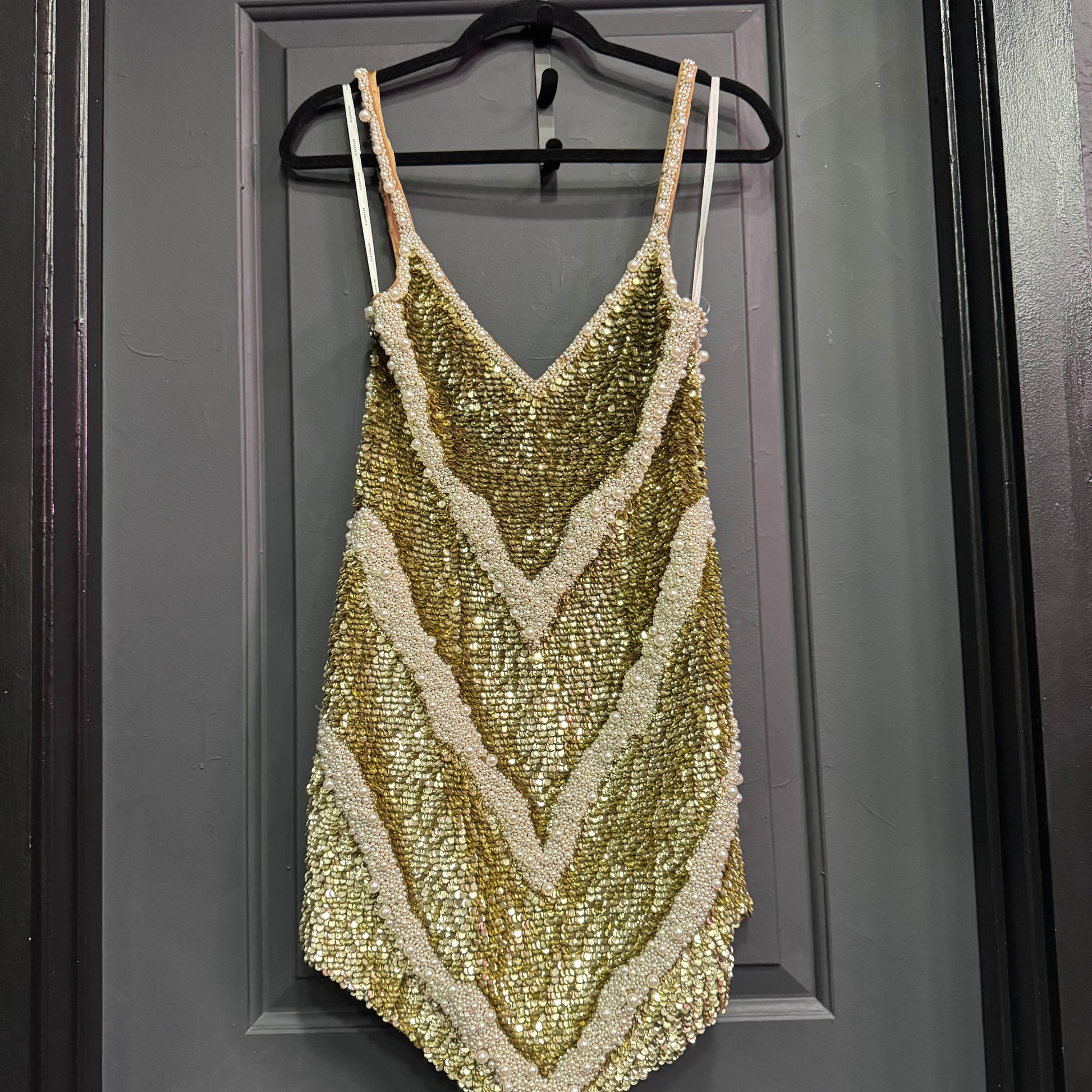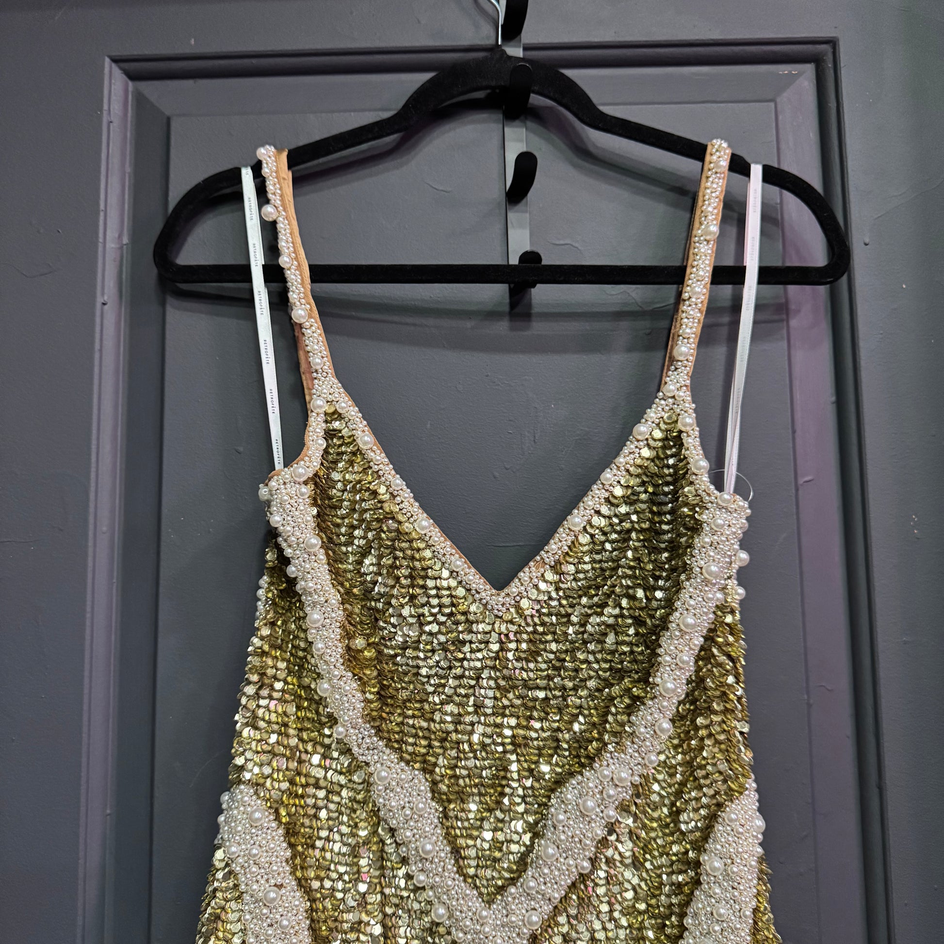 Exude effortless glamour in our Inessa Dress. This show-stopping mini dress features intricate sequin embellishments, a chic and flattering silhouette, and adelicate feather trim. A luxurious choice for cocktail parties, evening soirees, or any occasion where you want to make a statement. Shown here in Gold/White.