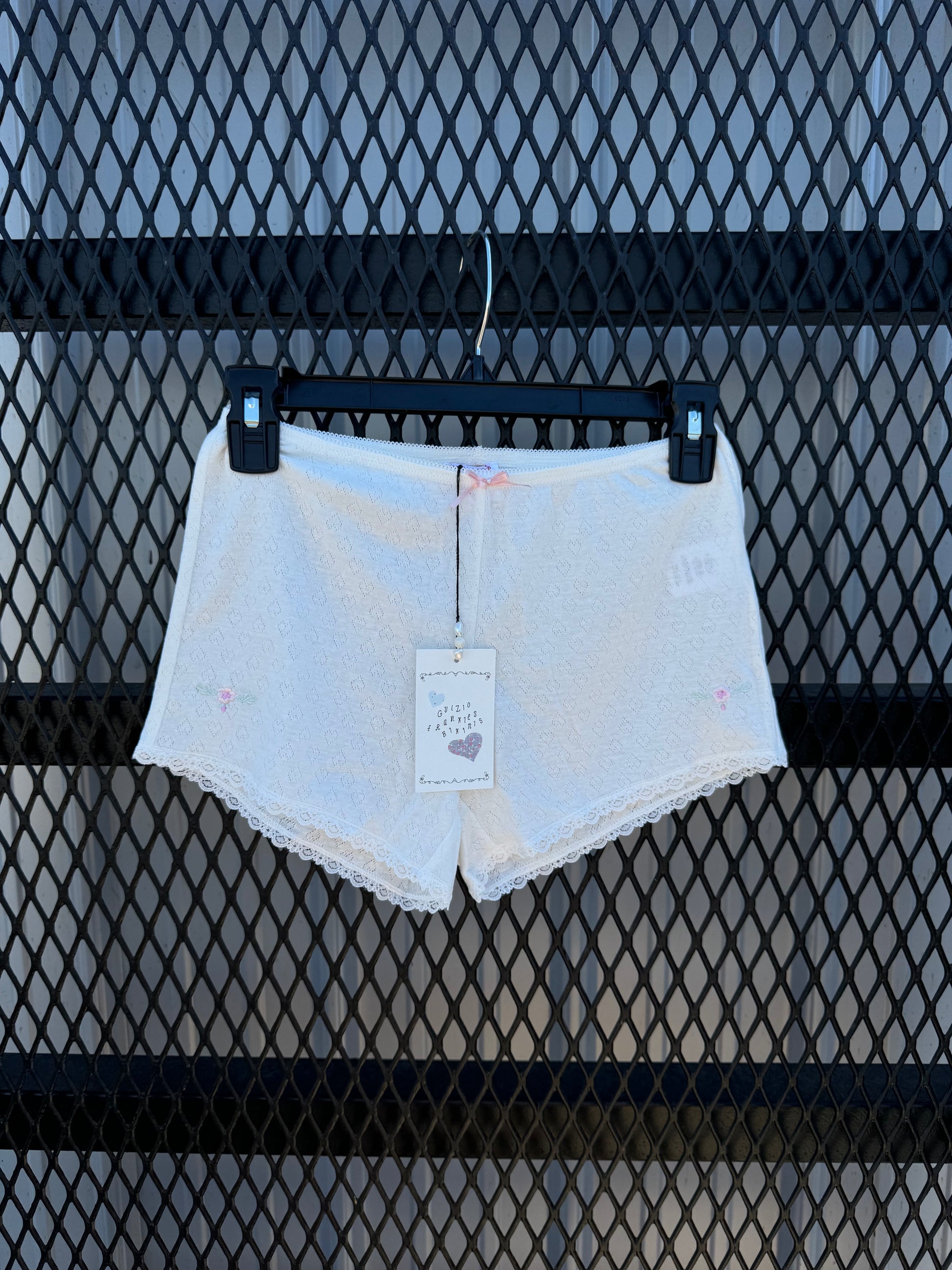 An all-new mini short cut from the softest baby heart pointelle fabric. Meet Laila, a sweet mini short with symmetrical floral embroidery, a baby bow detail, and micro lace trim, exclusively from the Frankies Bikinis x GUIZIO collaboration.