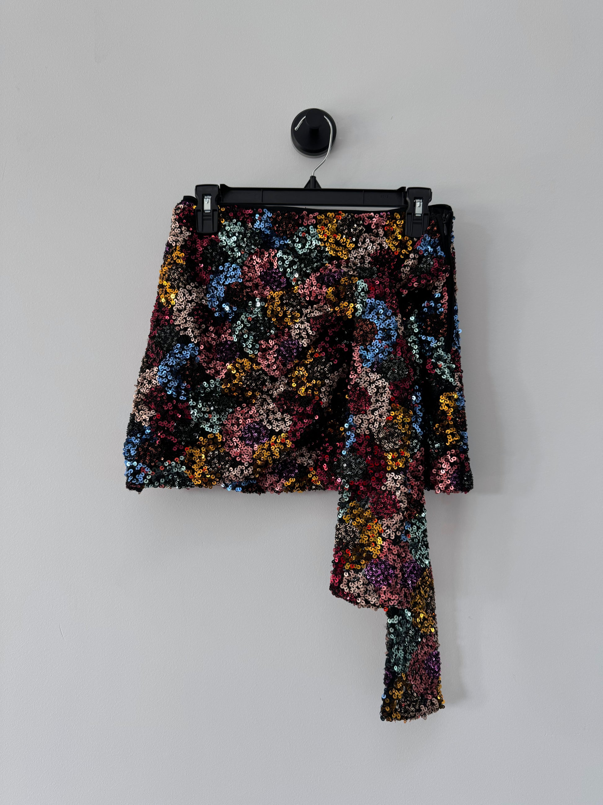 Lulus Exclusive! Make it a glam night to remember with the Lulus Let's Party Multi Color Sequin Faux-Wrap Mini Skirt! Sheer mesh adorned with glitzy multi color sequins, in various sizes, shapes this skirt that has a high waisted fit and an A-line silhouette with an overlapping panel that ties at the side.
