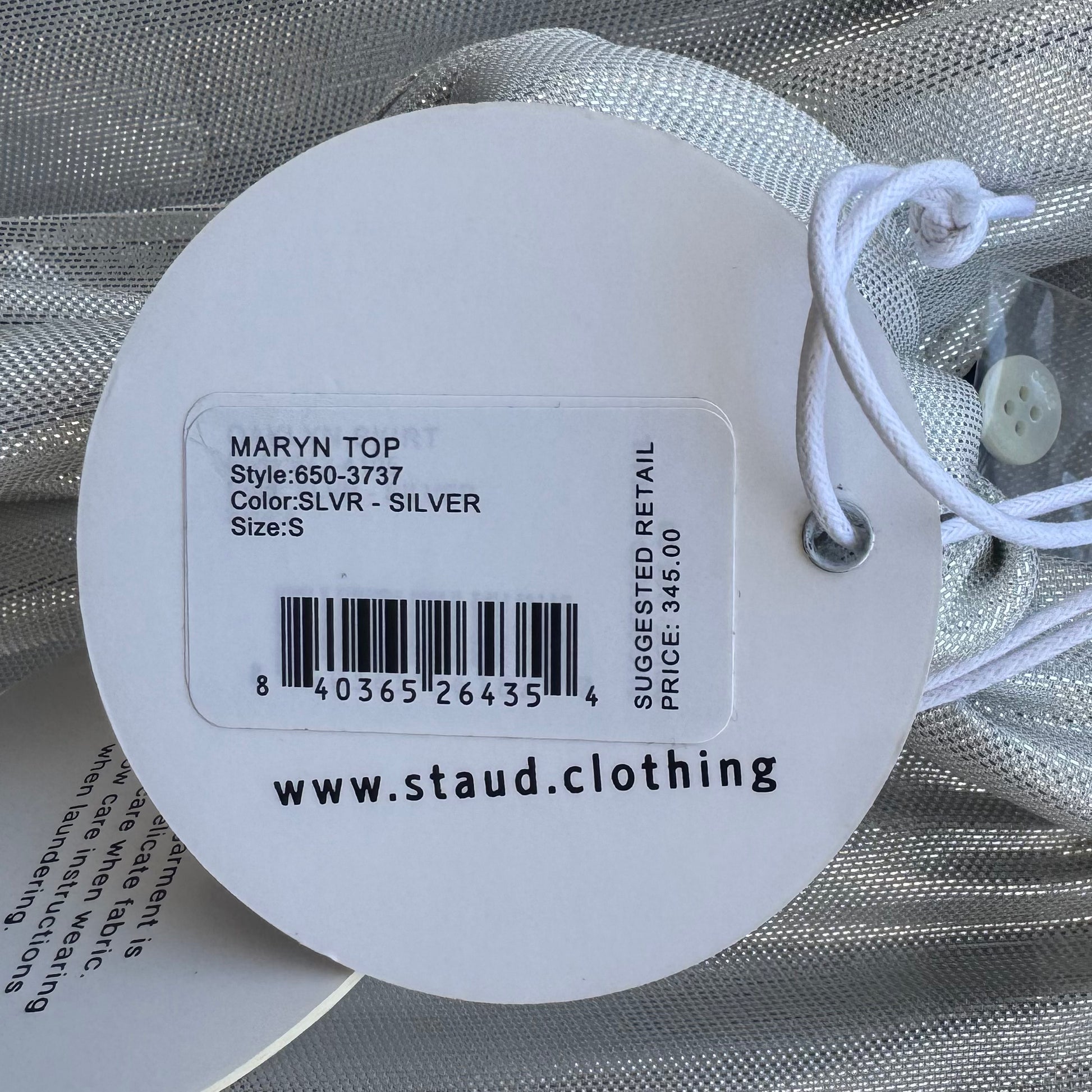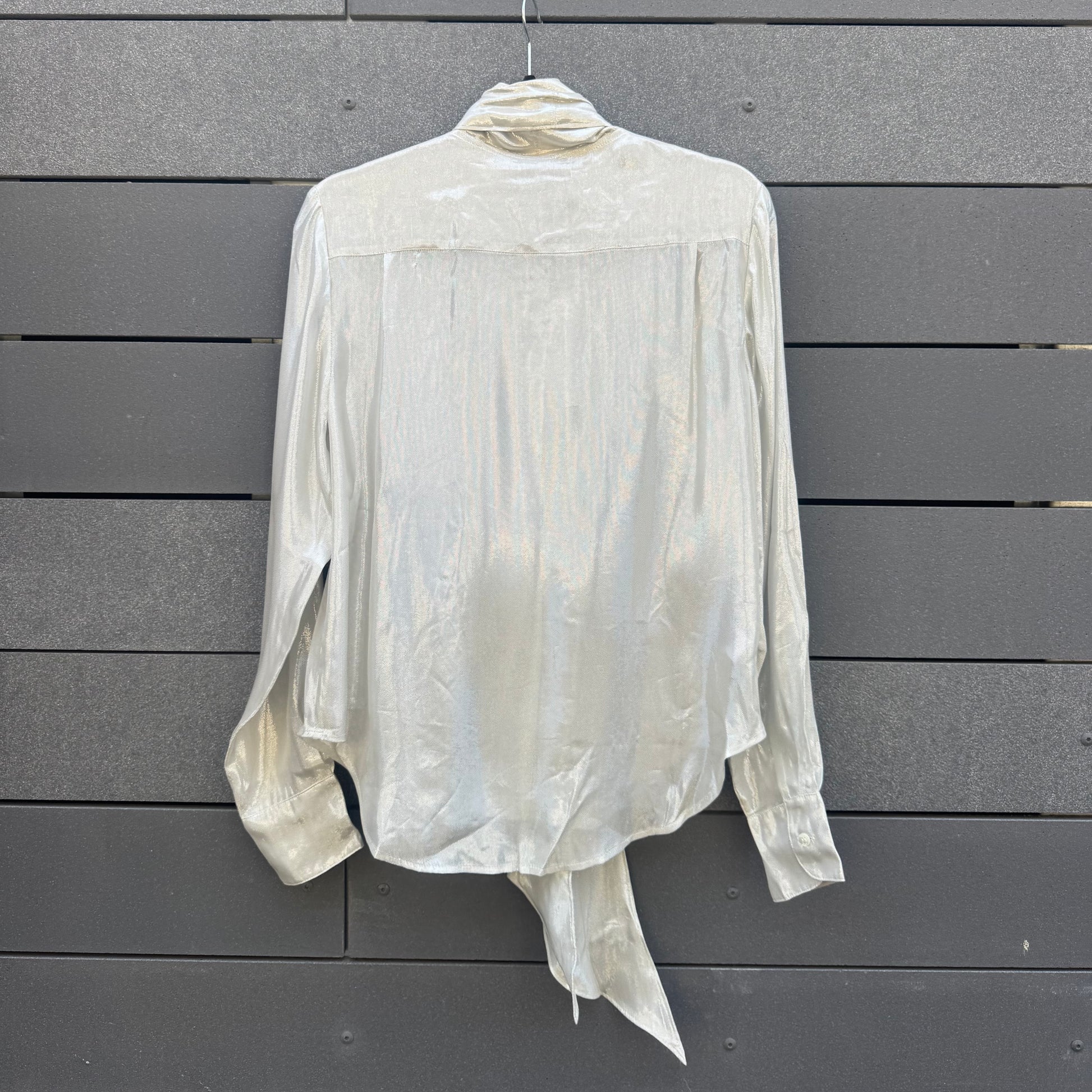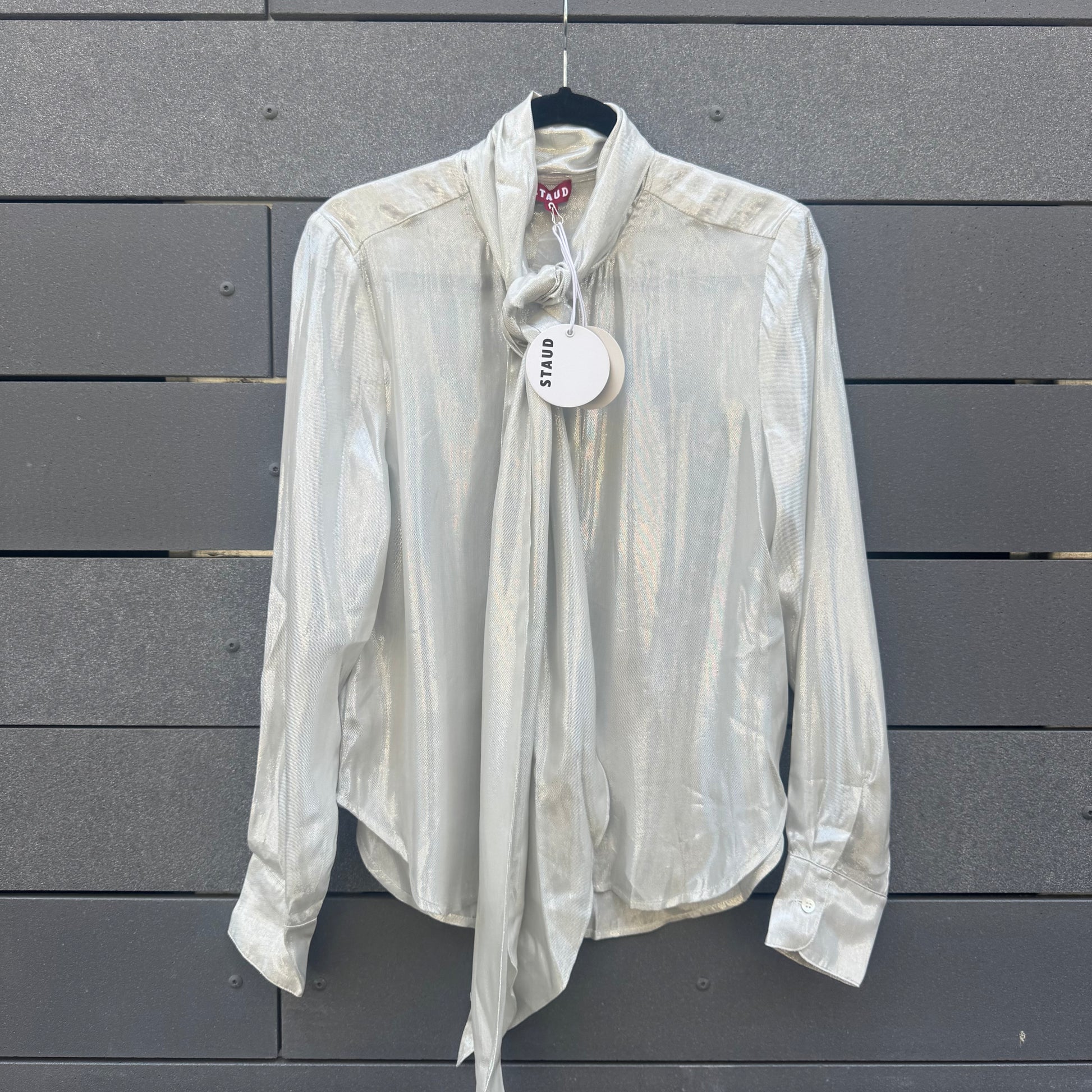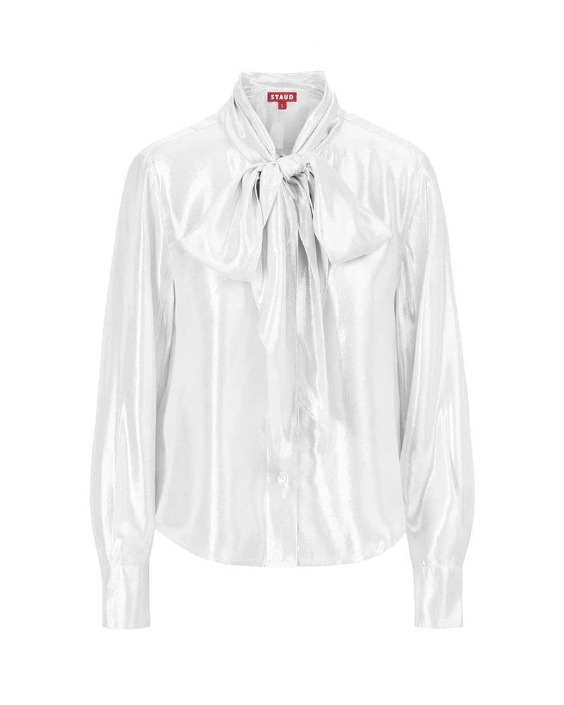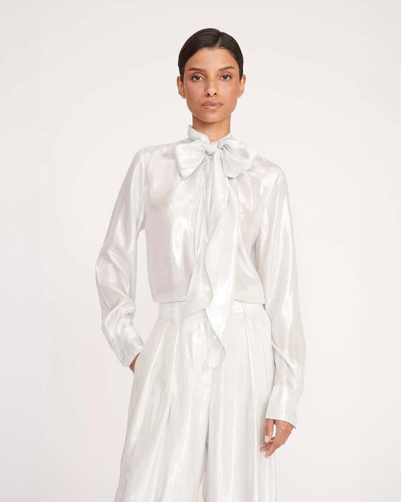 A classic button front blouse, updated with an oversized bow detail at the neck. The Maryn Top is cocktail-party ready in this silver lamé finish.