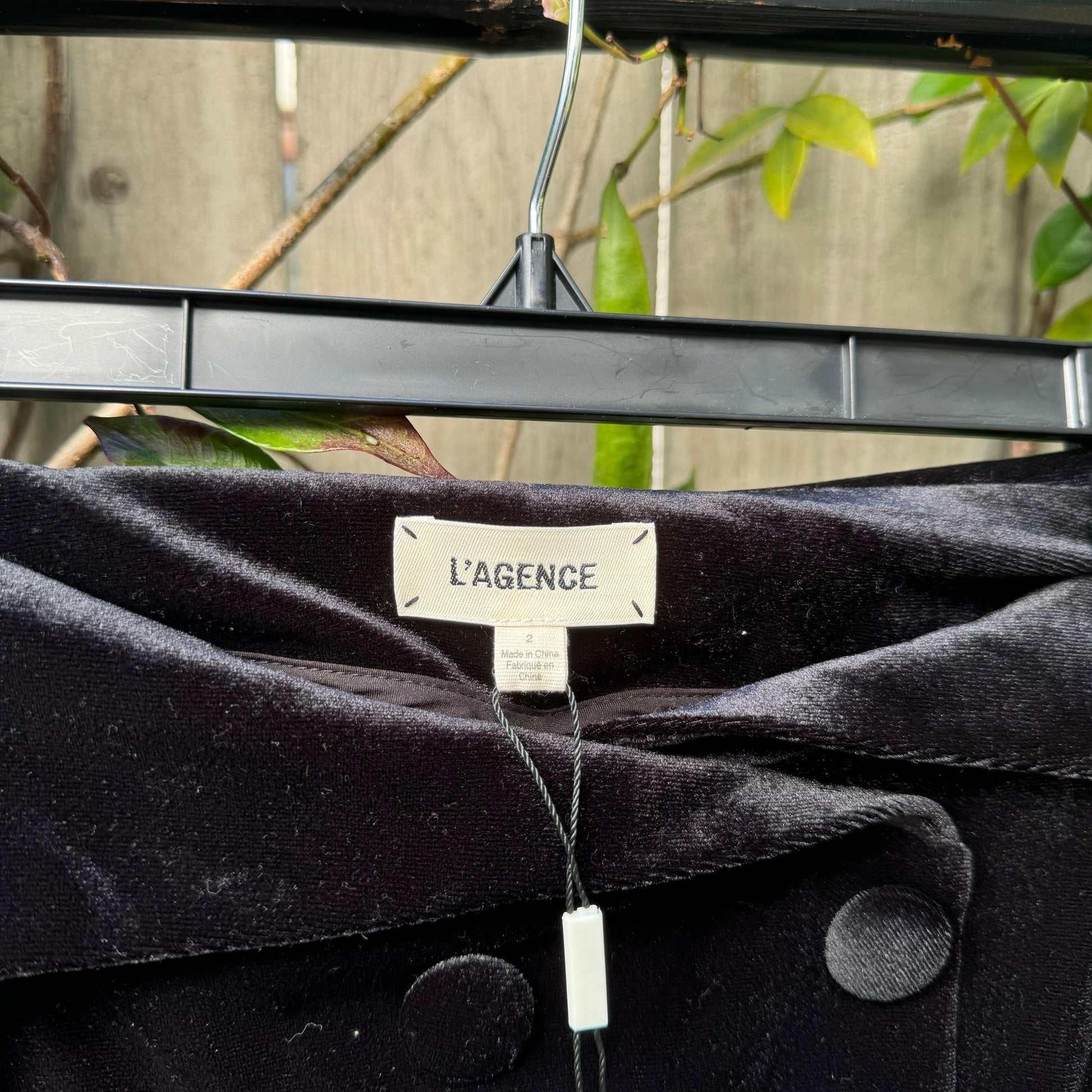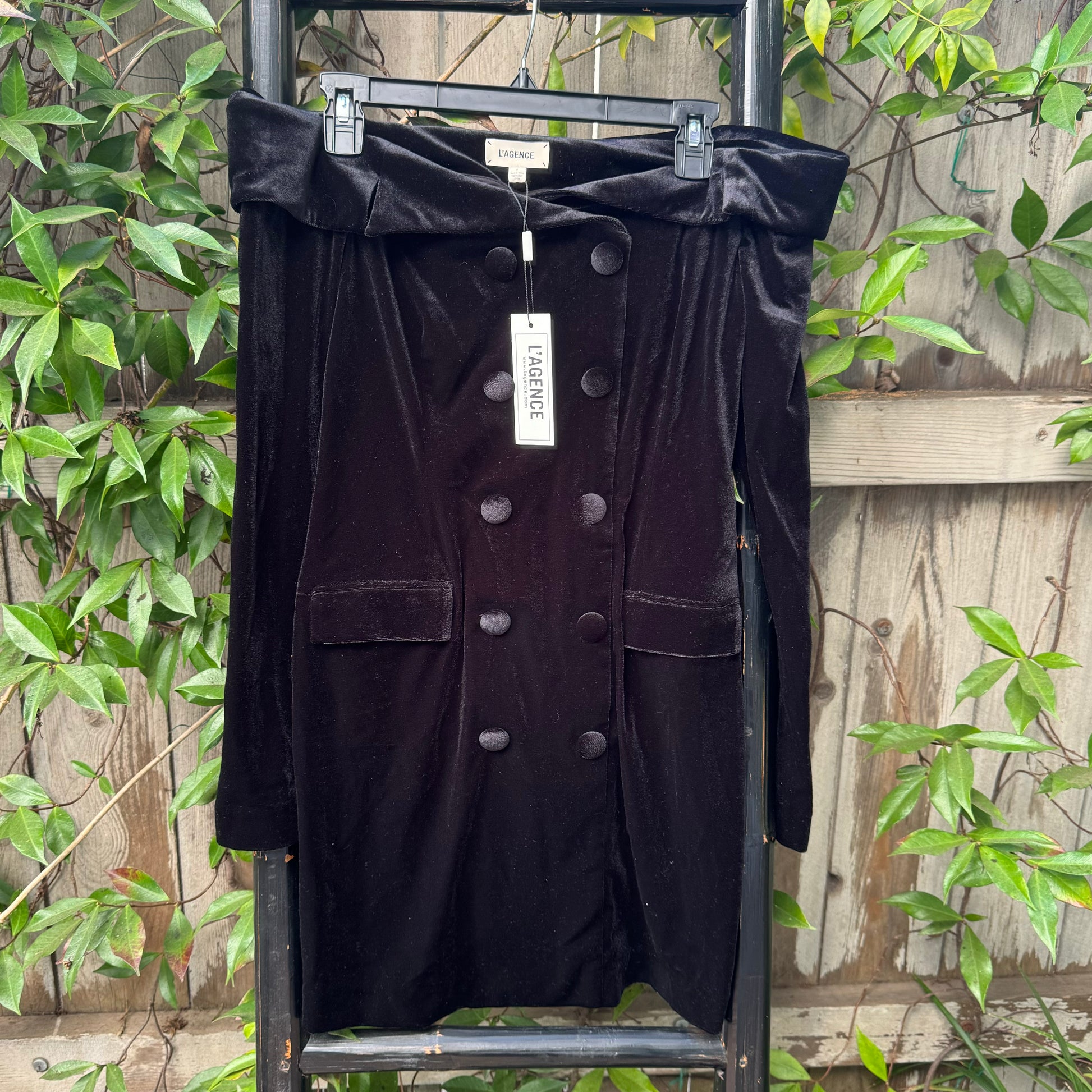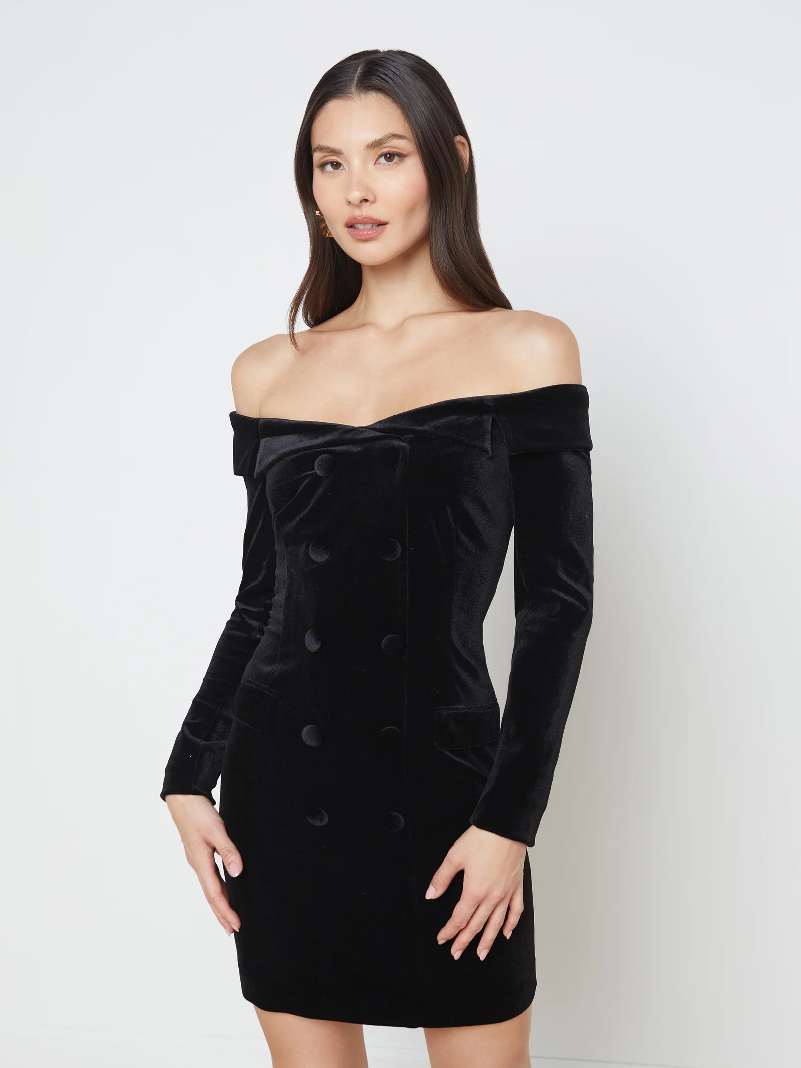 An ultra-feminine off-the-shoulder blazer dress in black stretch velvet. Slim-fit style hugs the figure from just beneath the shoulder to hem. Lapel-accented neckline and faux double-breasted front with chic self buttons and flap welt pockets add a sartorial touch. No closures.