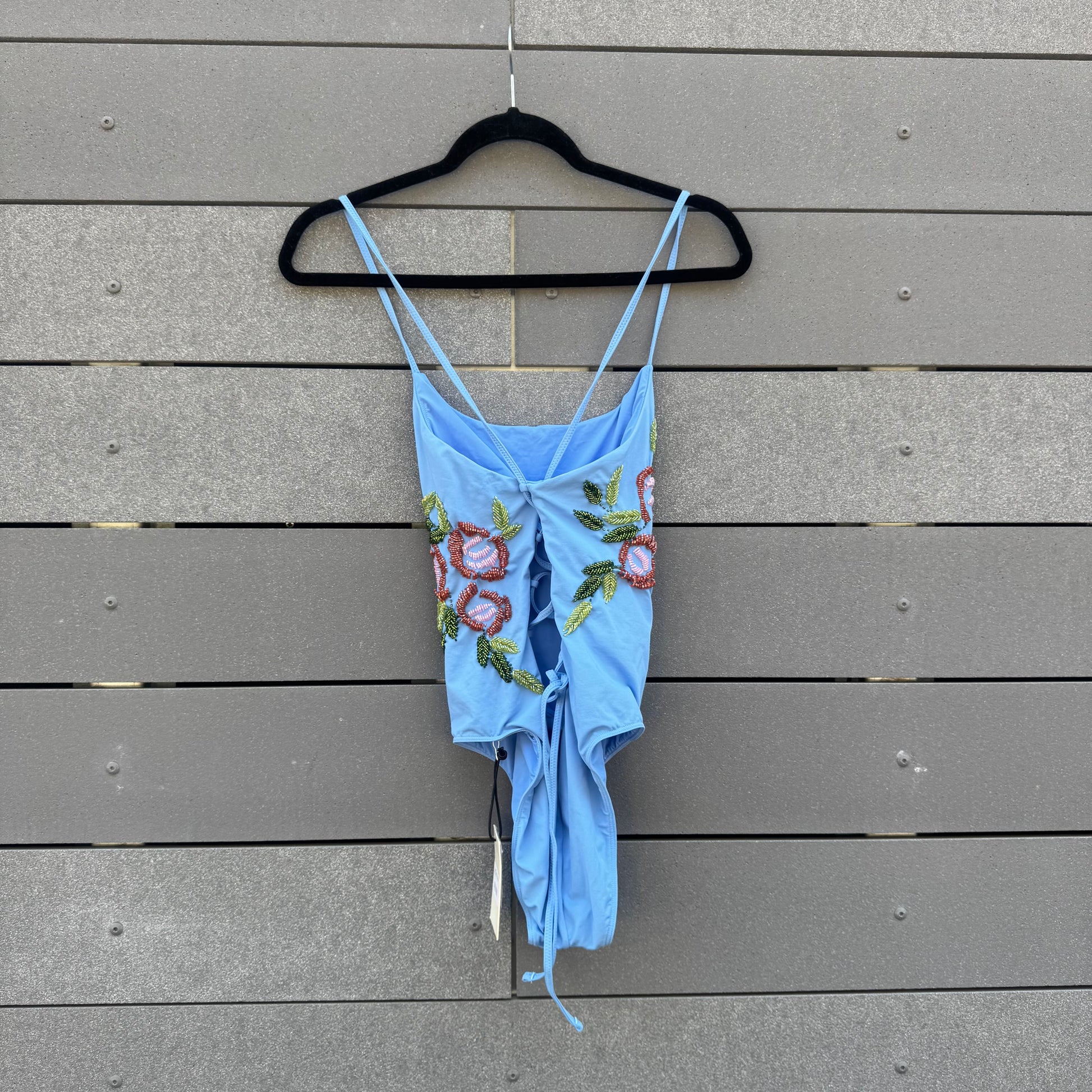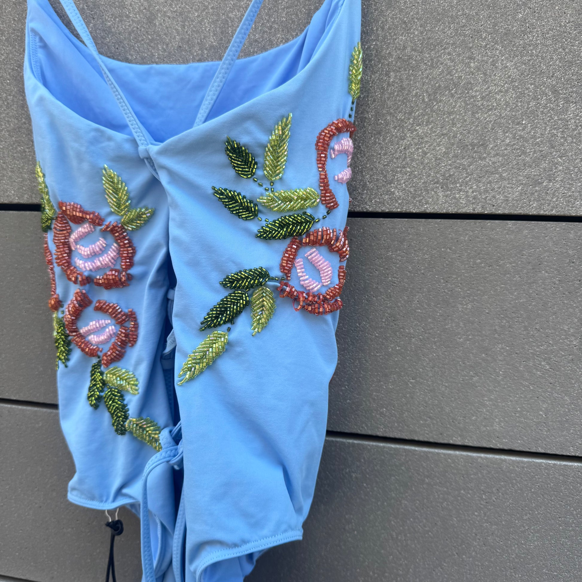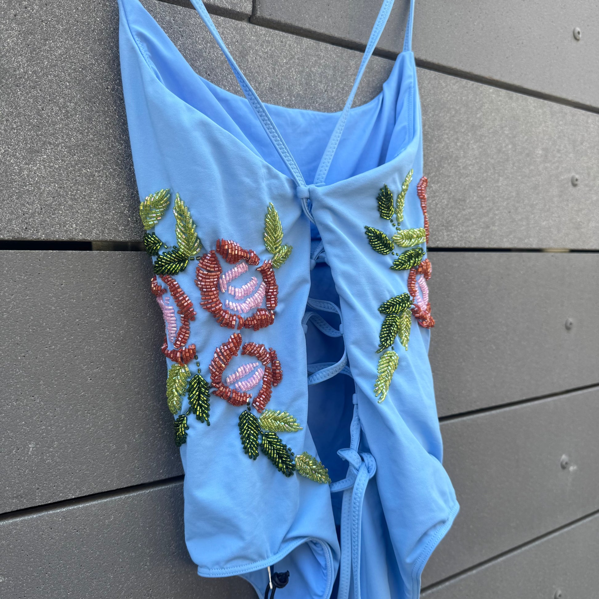 Beaded glass floral embellishmentsAdjustable shoulder straps and lace-up back.