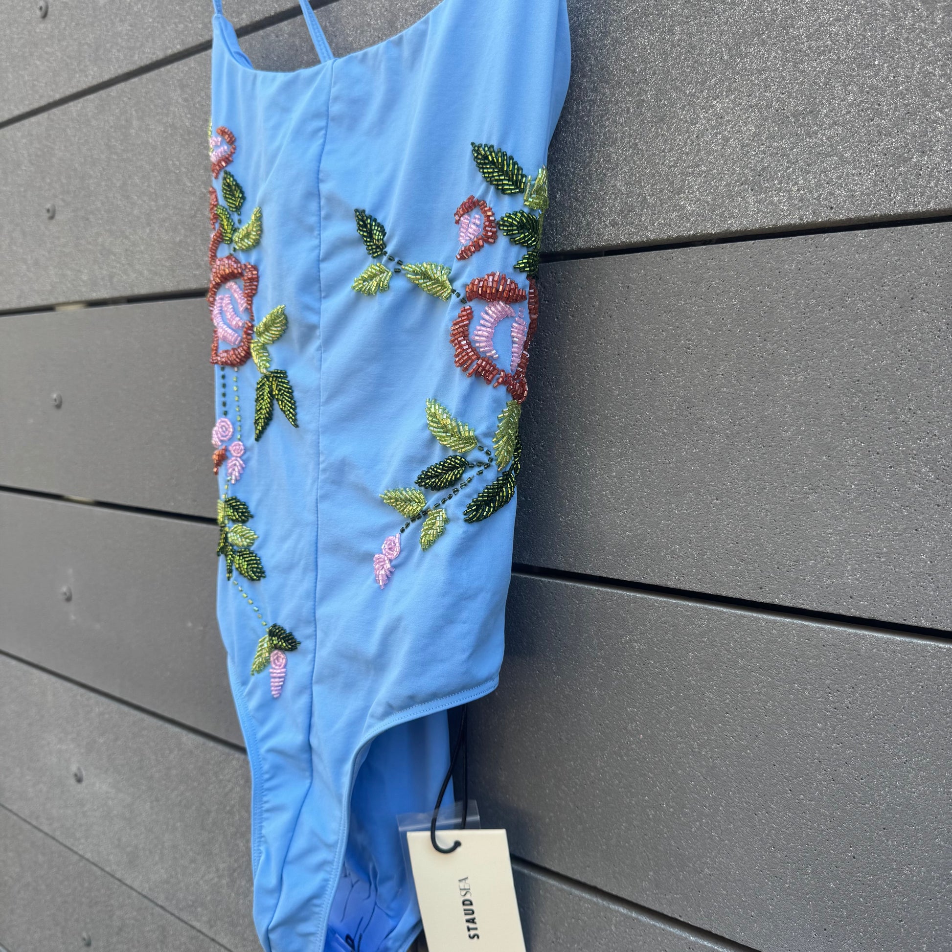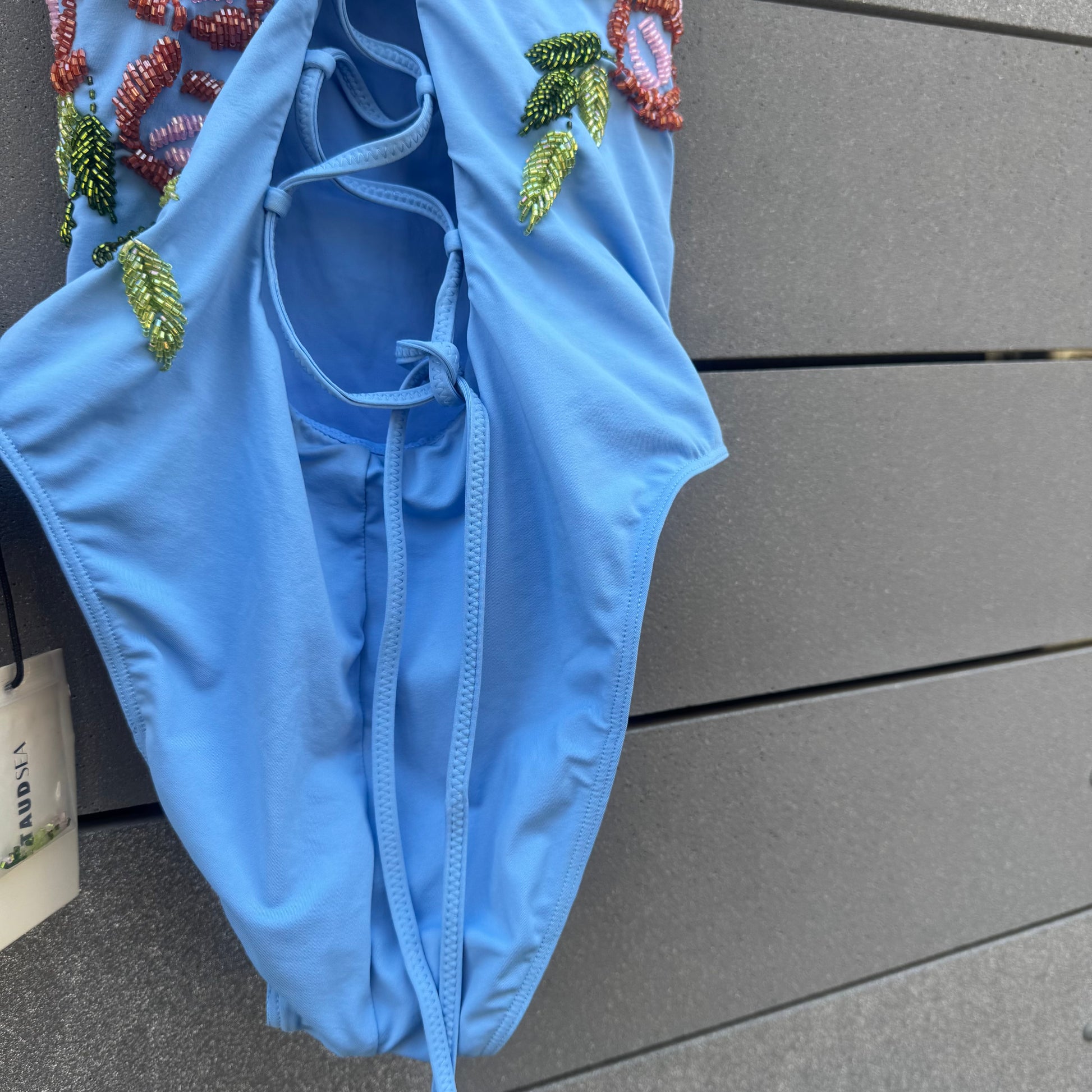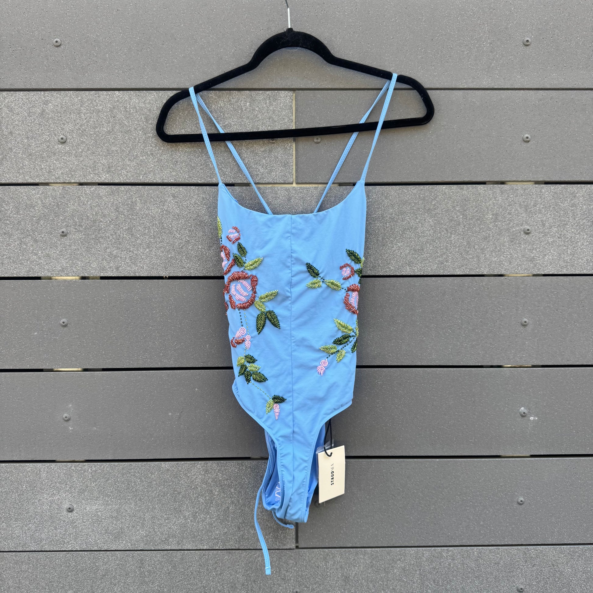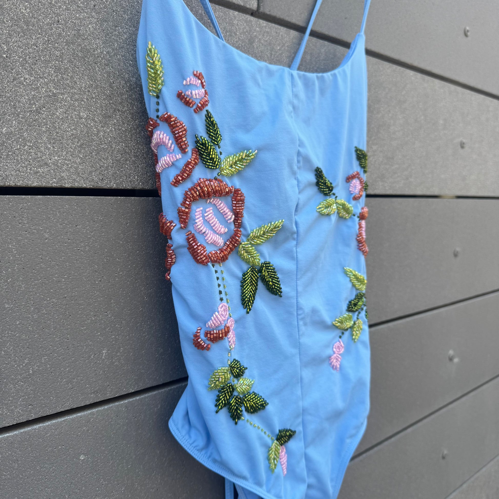 Beaded glass floral embellishmentsAdjustable shoulder straps and lace-up back.