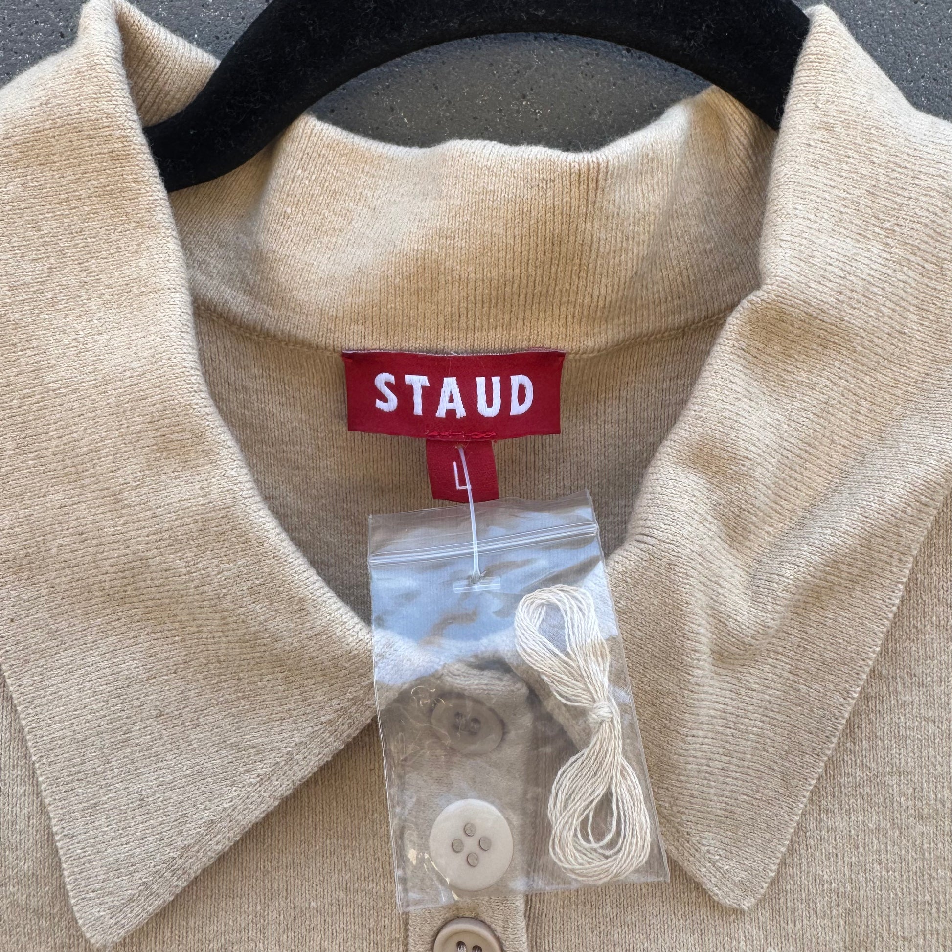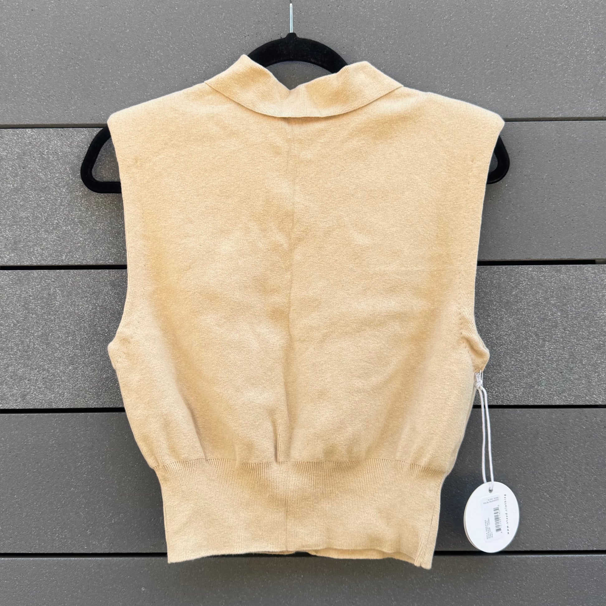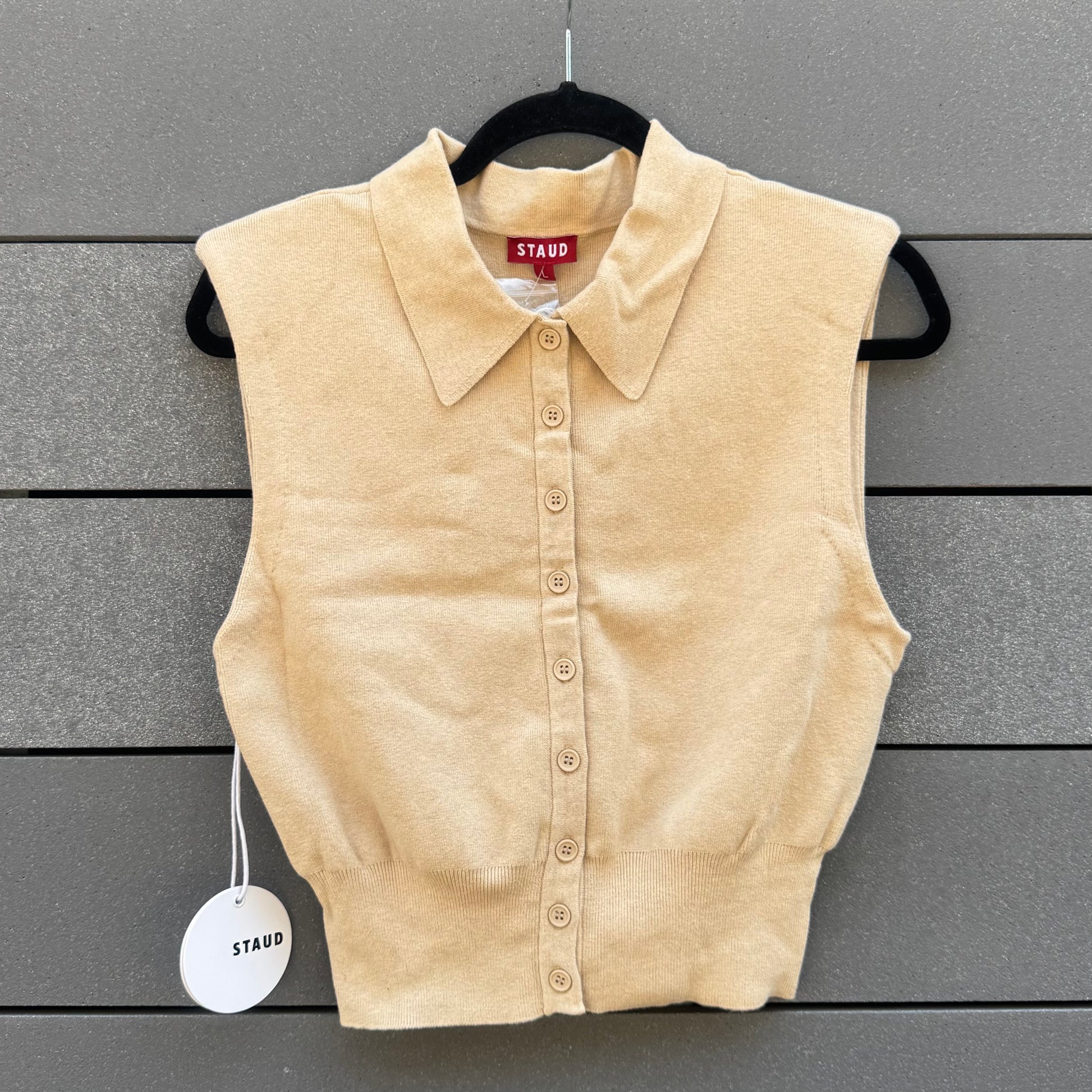 Collared neck and button placket. Sleeveless design with padded shoulders.