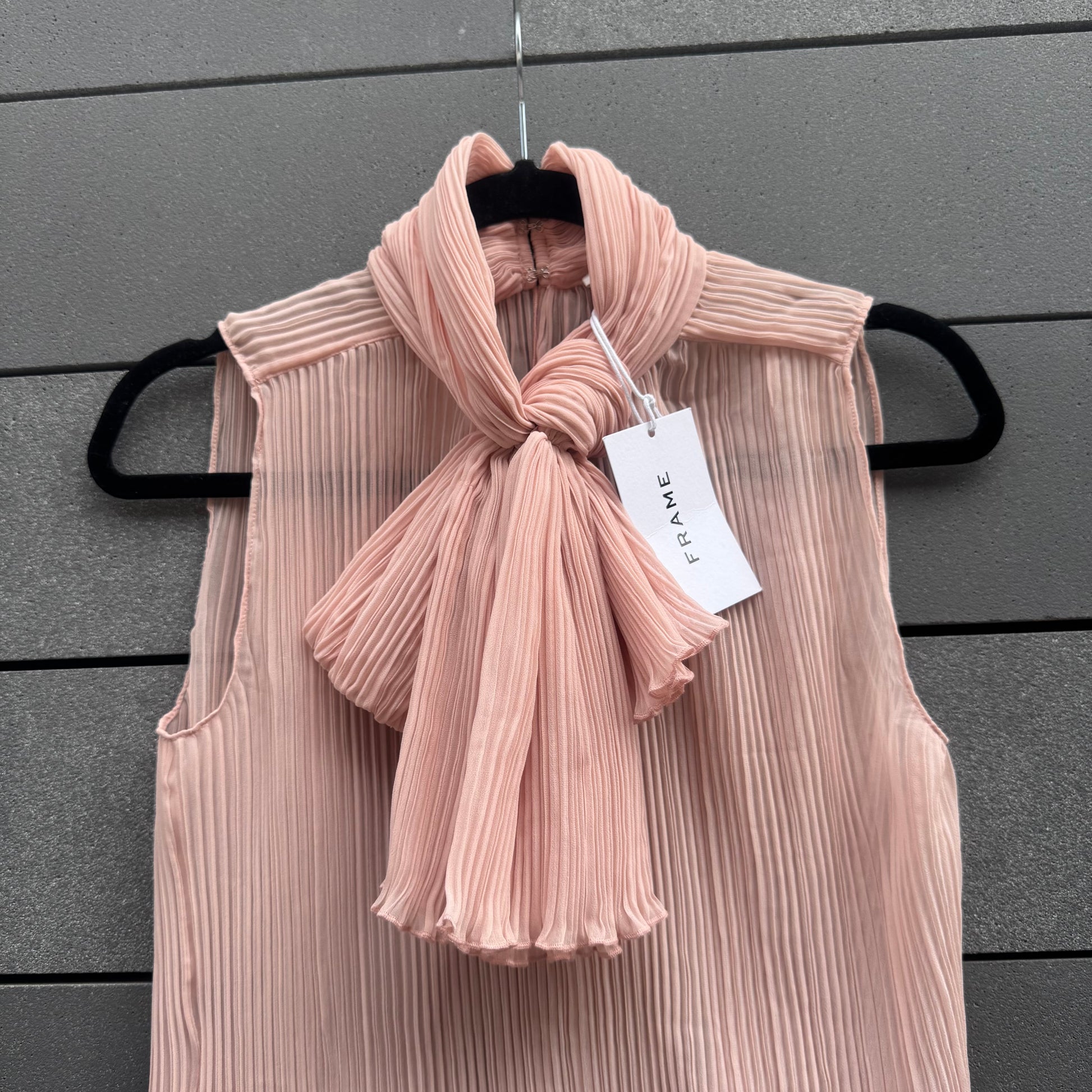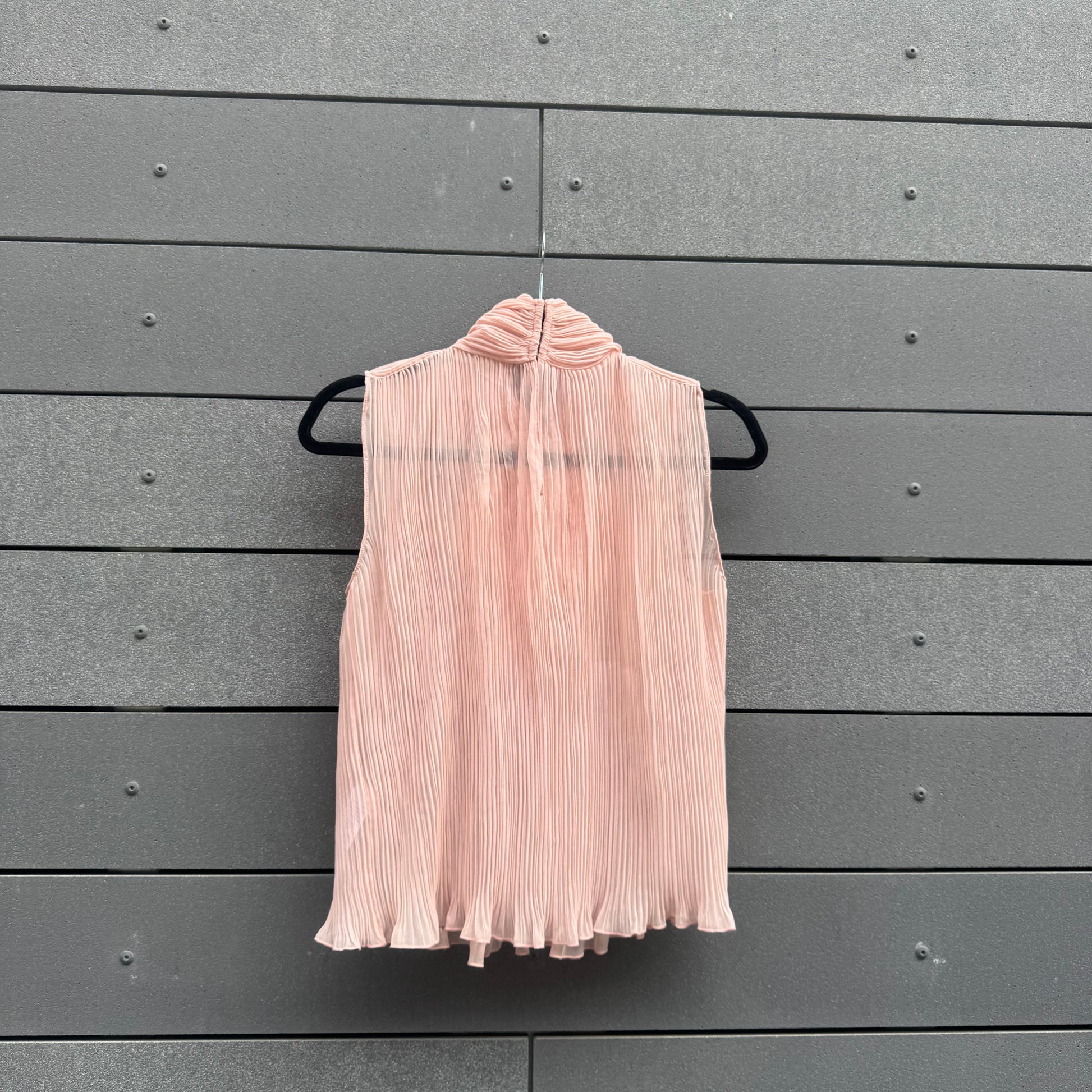 The Knot Blouse in Light Pink is a feminine and sophisticated piece, featuring delicate pleats and a statement knotted neckline. Its sleeveless design and airy silhouette make it a versatile choice for both day and evening wear.