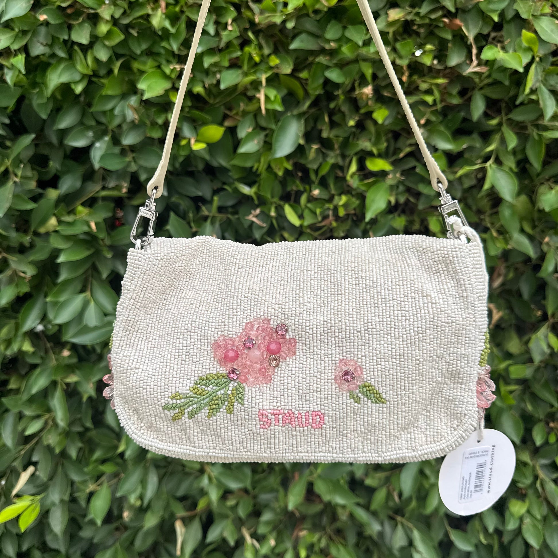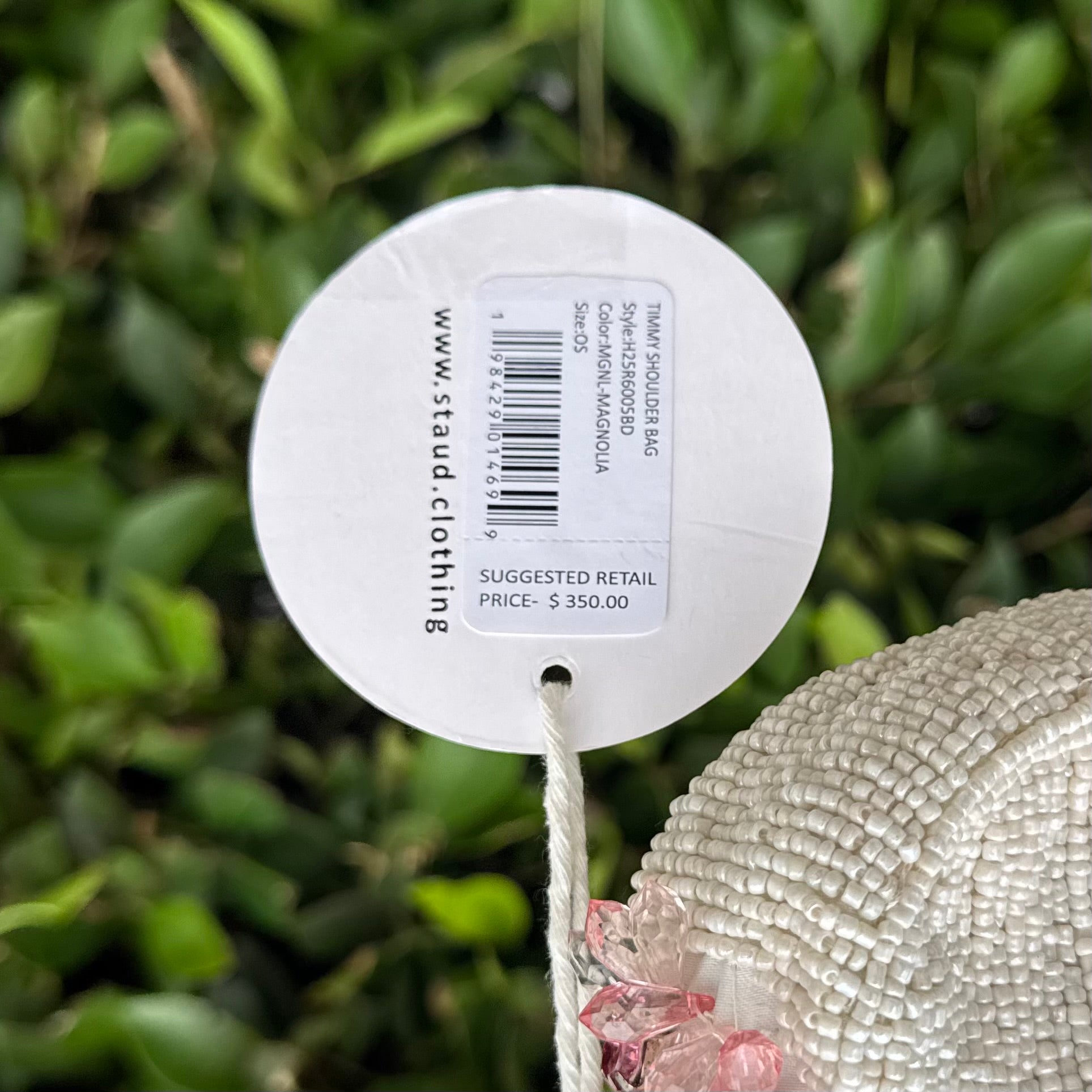 Staud's Timmy shoulder bag, crafted with glass beading in a floral motif, exudes a refined elegance. This sophisticated accessory features a removable strap, magnetic flap, and a single zip pocket for practicality and style.