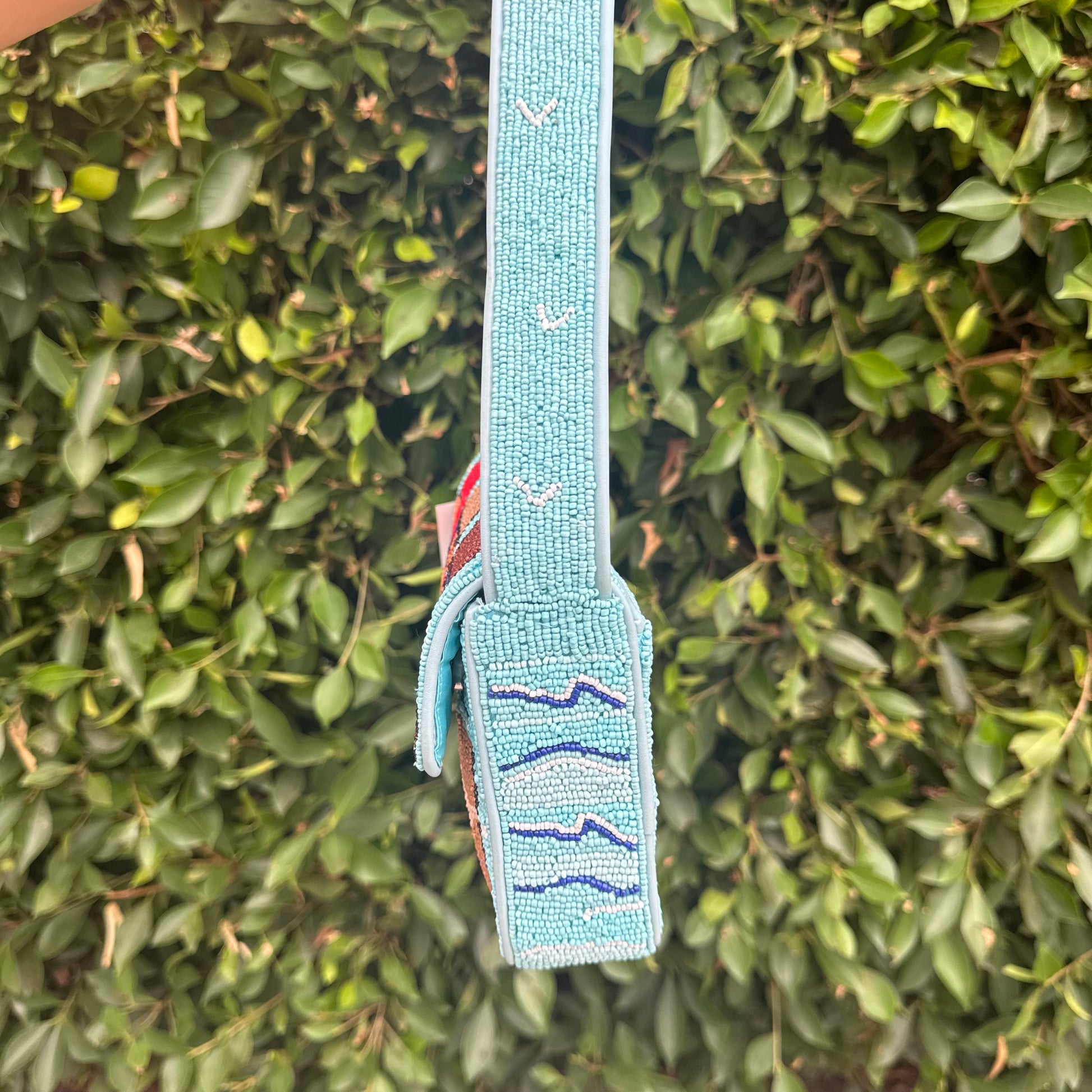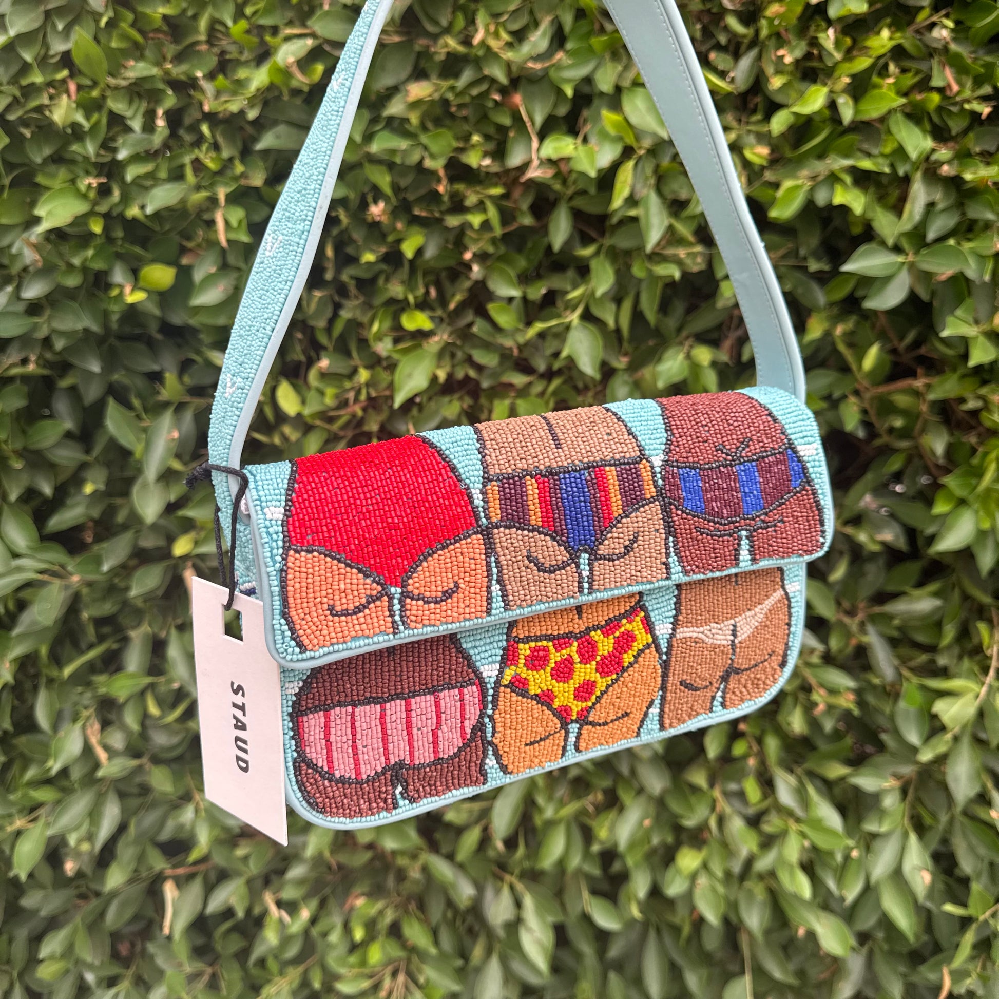 New in for Summer, our Beach Bums Tommy features a fun 'cheeky' seasonal print. The Tommy Bag is a hand-beaded shoulder bag with vegan leather piping. This style features a single flap closure, inner zip pouch and a pocket on the back.